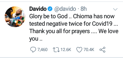 Weeks Ago It was announced that Davido’s Fiancee Chioma Rowland was tested positive for Coronavirus after returning from vacation in London, after isolation, treatments and prayers from well wishers it was announced last night by her fiance (Super Star Nigerian Singer) Davido that she’s now Negative after the second test said so. Tweet Below ????