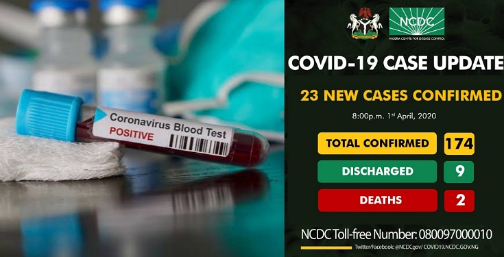 As at 08:00 pm 1st April there are 174 confirmed cases of #COVID19 reported in Nigeria. Nine have been discharged with two deaths.
